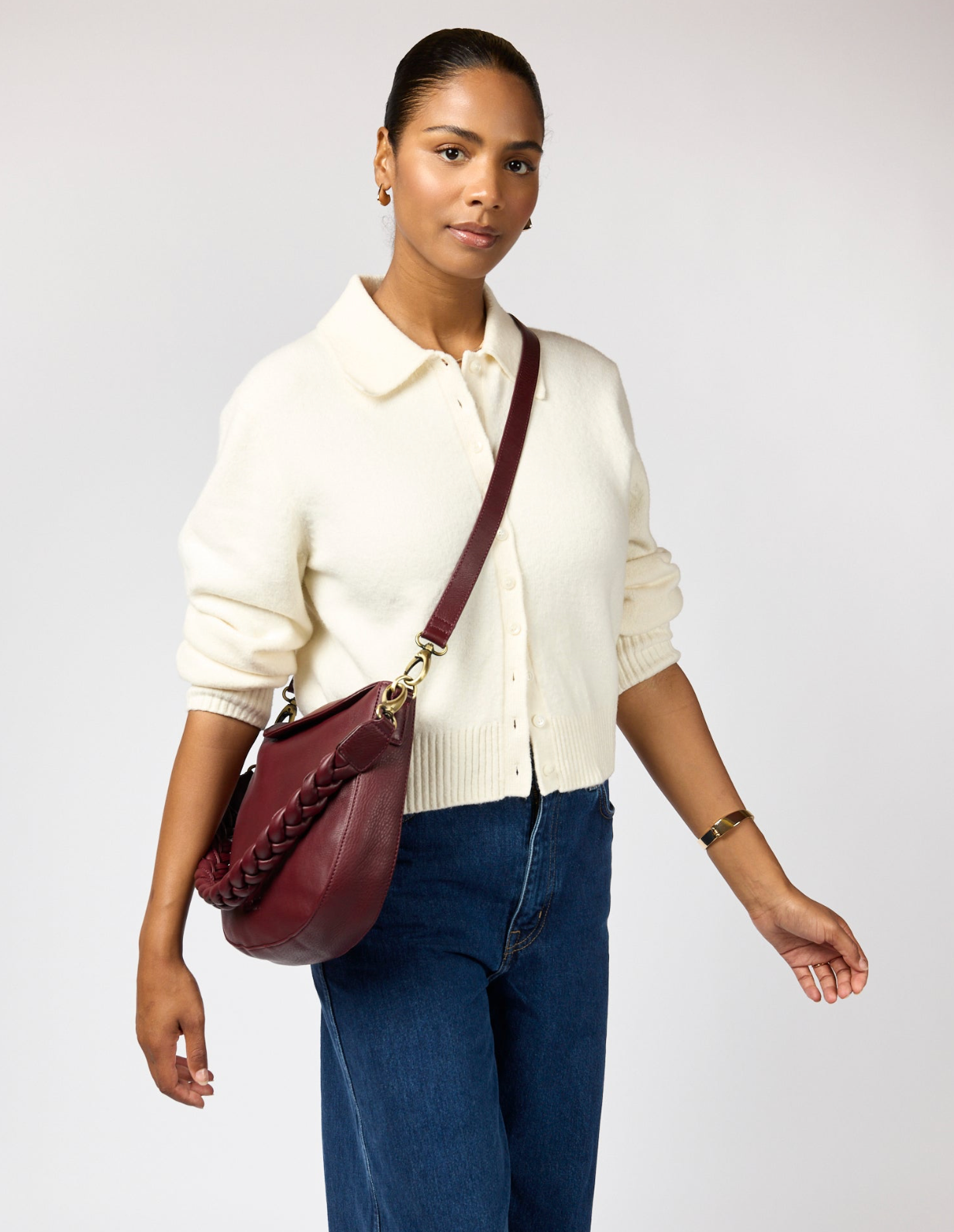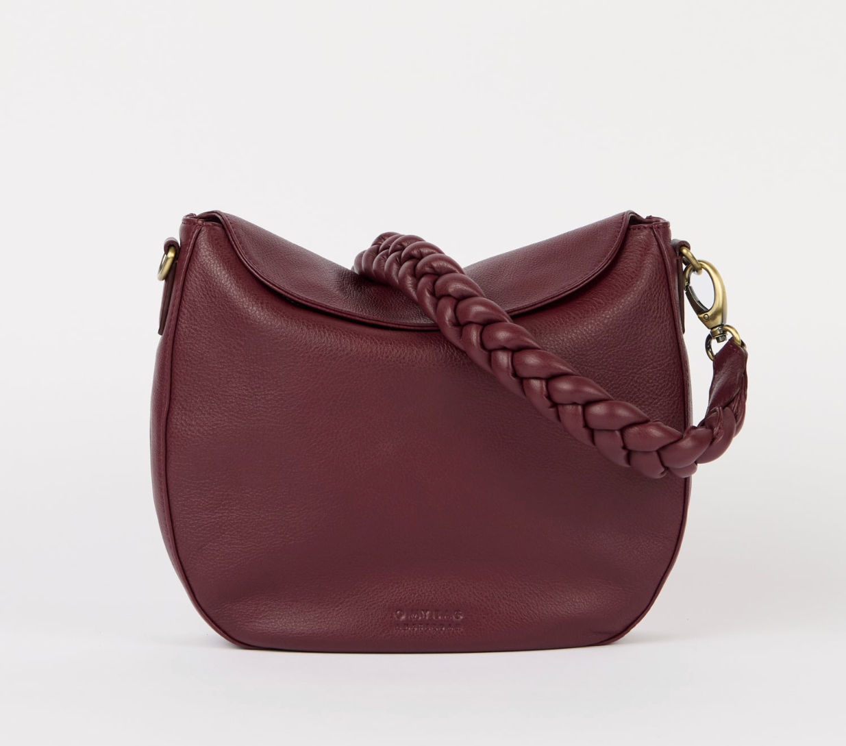 Laukussa on kevyesti kaartuva siluetti ja elegantti burgundin väri, joka korostaa nahan syvyyttä ja lämpöä. Punottu hihna lisää ripauksen boheemia viehätysvoimaa, kun taas säädettävä olkahihna tarjoaa joustavuutta ja kätevyyttä.
