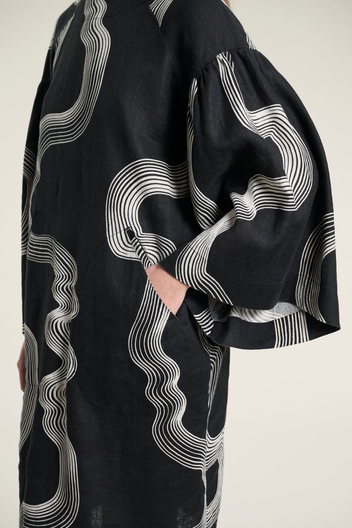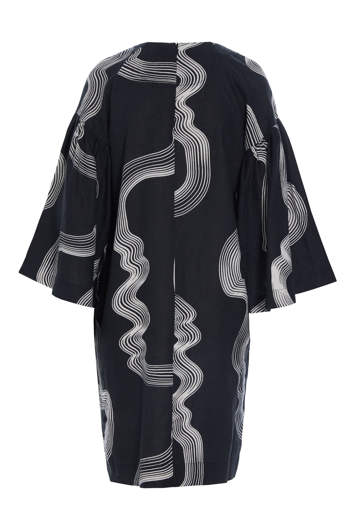 Hikazu -pellavamekko hurmaa graafisella kuviollaan, jossa valkoiset linjat luovat elävän, taiteellisen ilmeen. Mekossa on huikean kauniit isot ja näyttävät hihat, jotka tuovat asuun kevyttä veistoksellisuutta. Suoralinjainen malli laskeutuu ilmavan kauniisti. Sivuille sijoitetut taskut lisäävät käytännöllisyyttä ja tekevät mekosta miellyttävän käyttää.