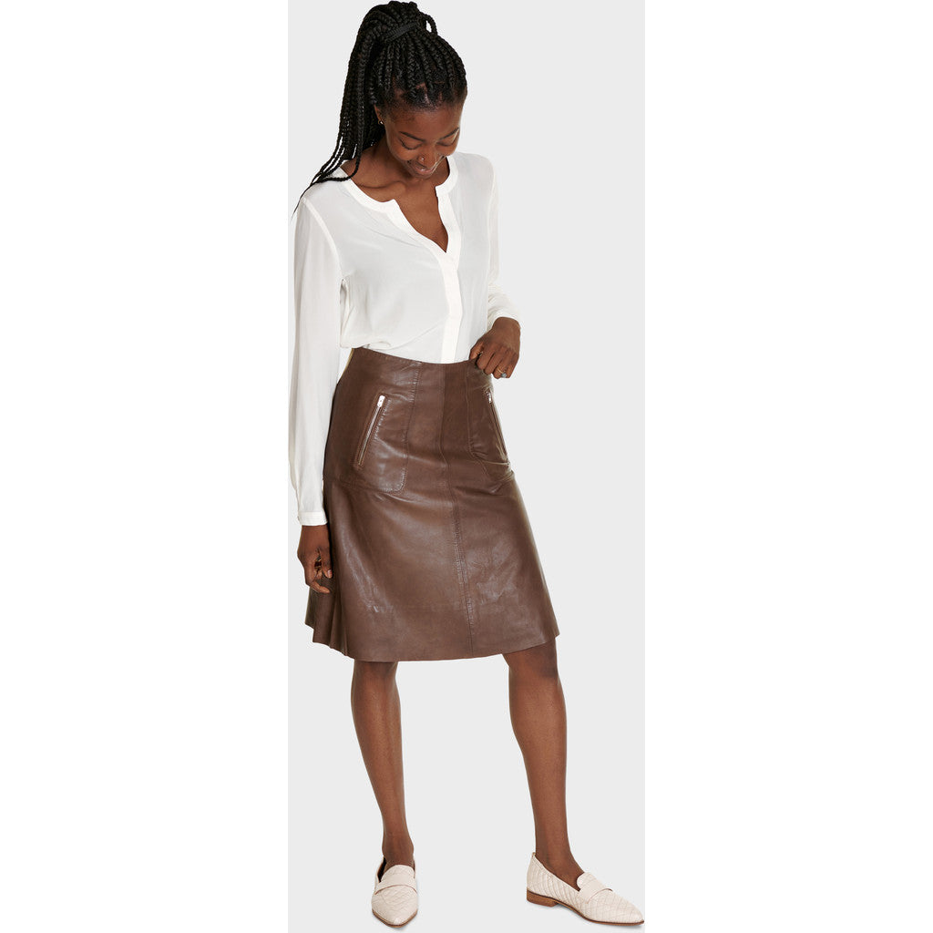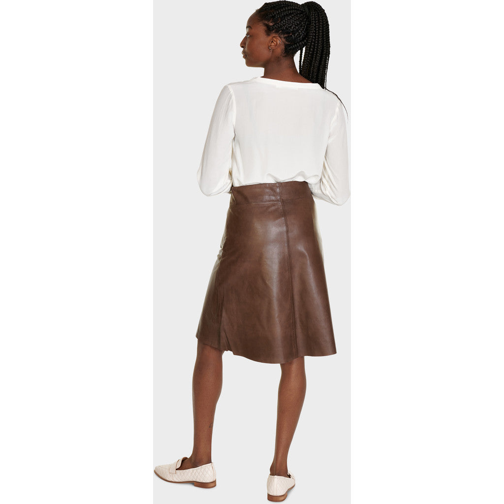 Huikean kaunis A-linjainen polvipituinen nahkahame, joka on valmistettu pehmeästä lampaannahasta. Värinä on tämän hetken ykkösväri. Hameesta löytyy kaksi vetoketjullista taskua. Tyylikäs yhdistettävä saappaiden ja pehmeän neuleen kanssa.