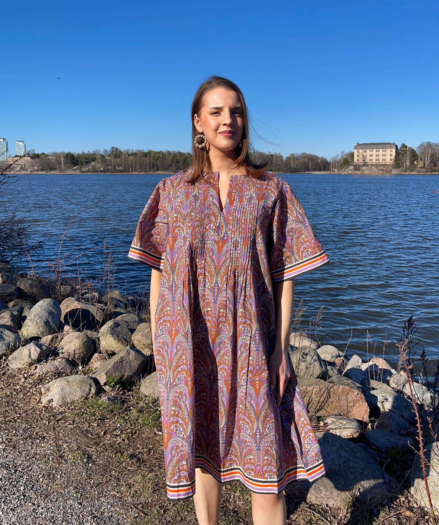 Tämä mekko hurmaa näyttävällä paisley-kuosillaan ja ilmavalla siluetillaan. Väljä, A-linjainen malli laskeutuu kauniisti ja tuntuu kevyeltä päällä. Etuosan laskokset tuovat ryhtiä yläosaan, ja lyhyet, väljät hihat viimeistellään kontrastiraidoilla, jotka tuovat kokonaisuuteen hienostuneen sporttisen vivahteen.