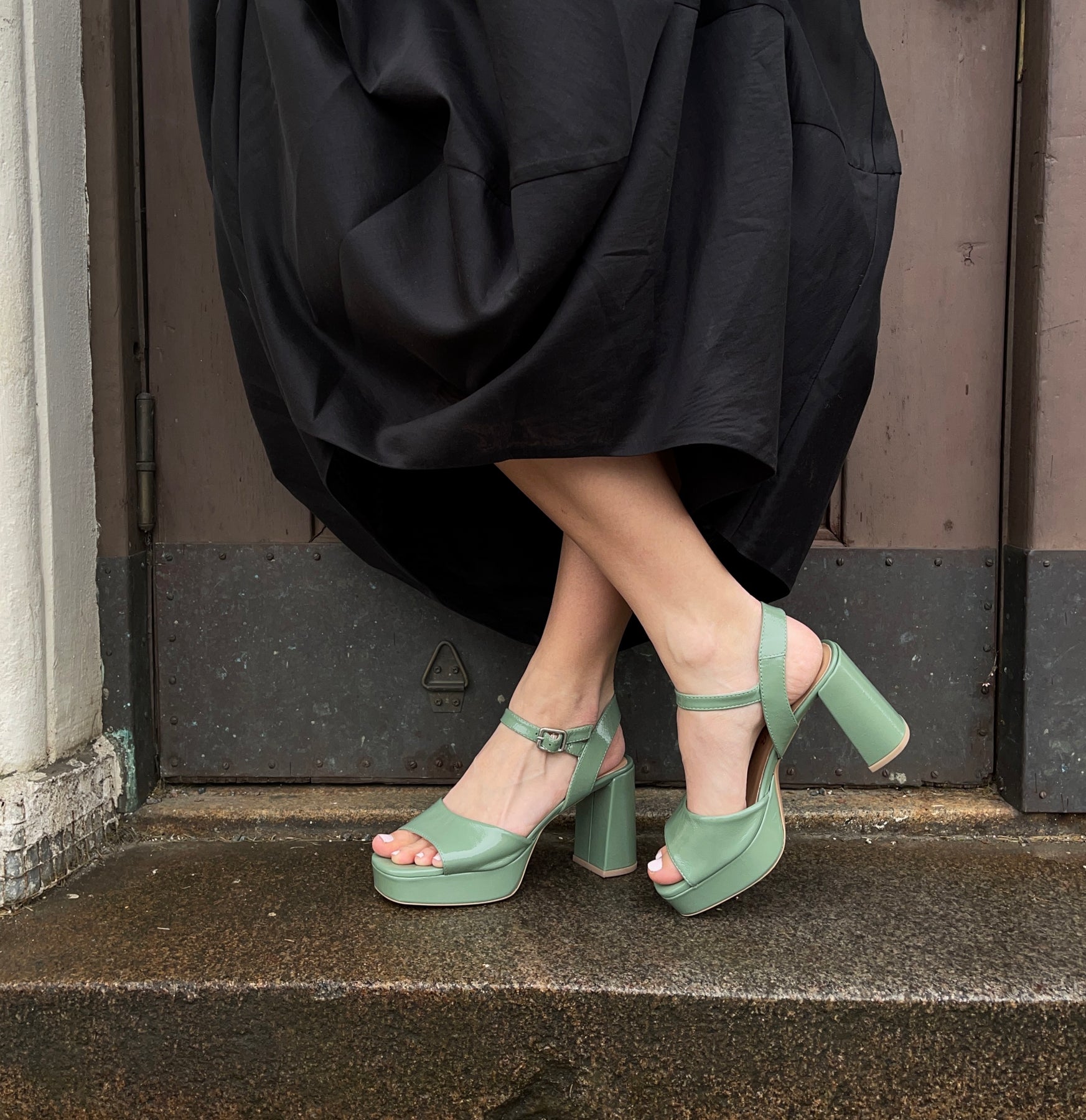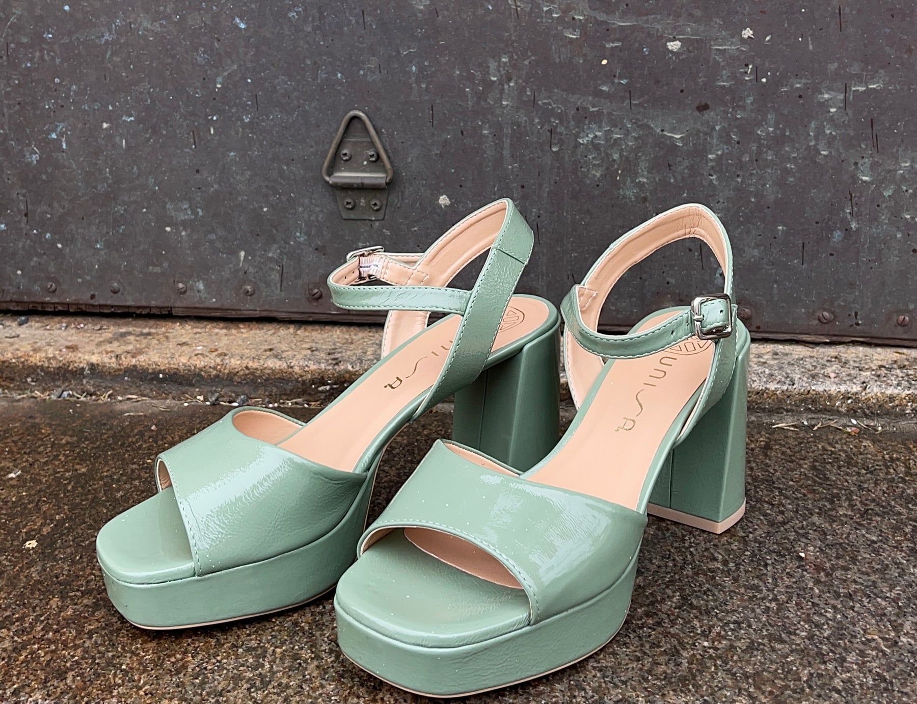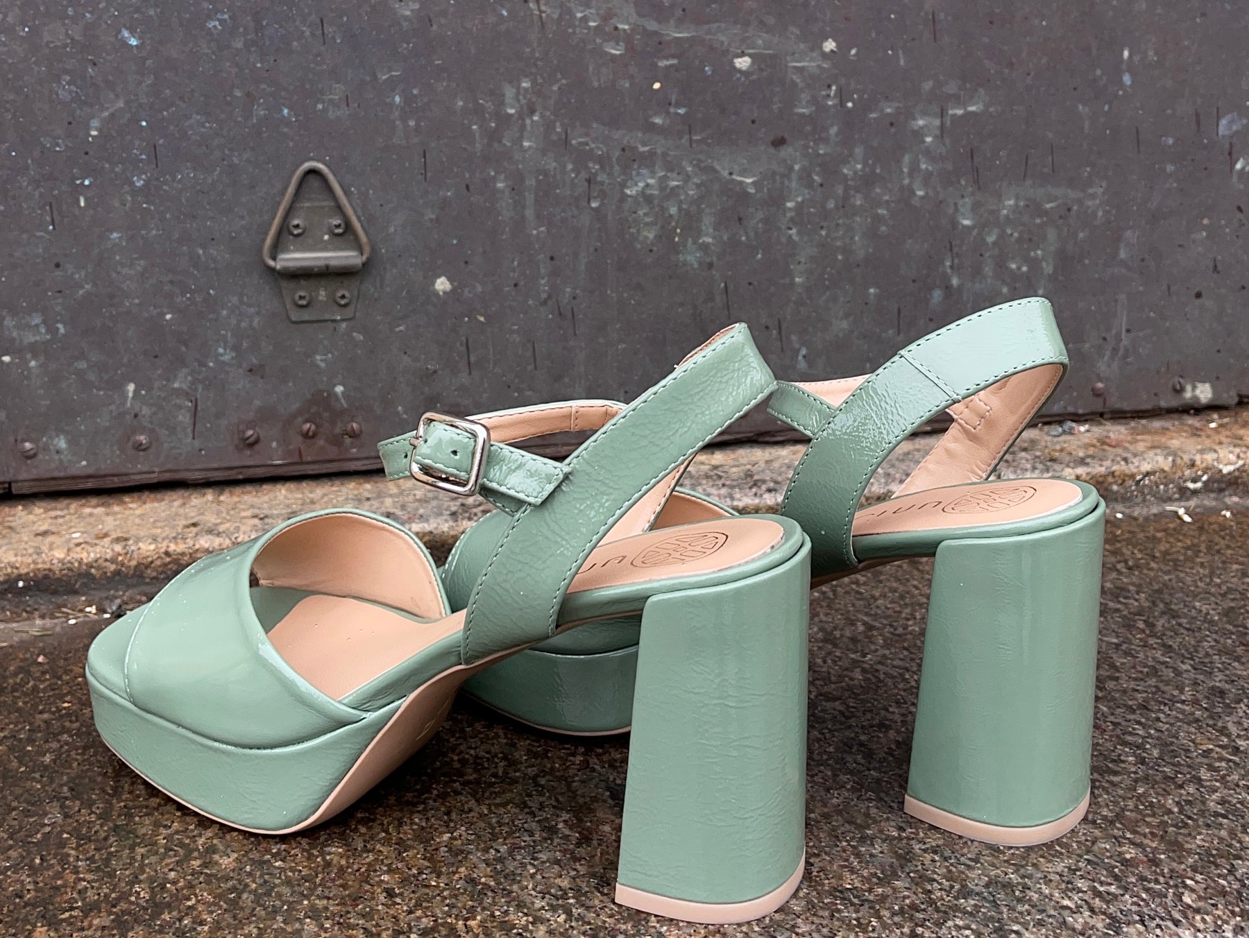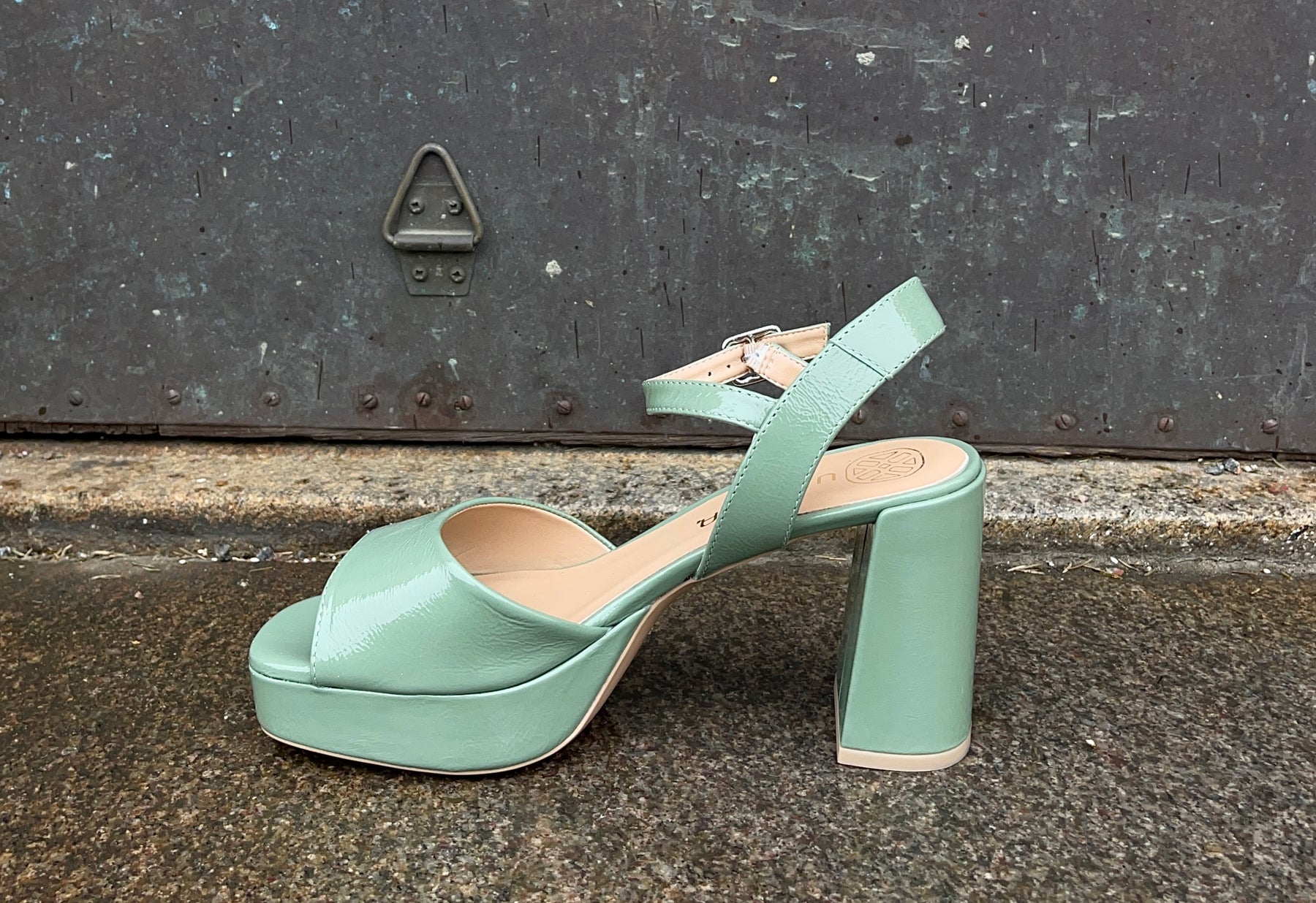 Mintunvihreä korkokenkä, jonka kiiltävä nahkapinta antaa mallille raikkaan ja huolitellun ilmeen. Selkeälinjainen leikkaus, siro nilkkaremmi ja tukeva korko luovat elegantin mutta modernin siluetin. Leikkisä sävy ja viimeistelty pinta tekevät kengästä näyttävän yksityiskohdan, joka tuo asuun keveyttä ja persoonallista ilmettä.