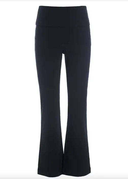 These pants flare out at the legs and have a wide waistband that can be pulled up over your stomach or folded down for a more traditional style. This feature makes the pants very comfortable. The fabric is stretchy, which ensures ease of movement.