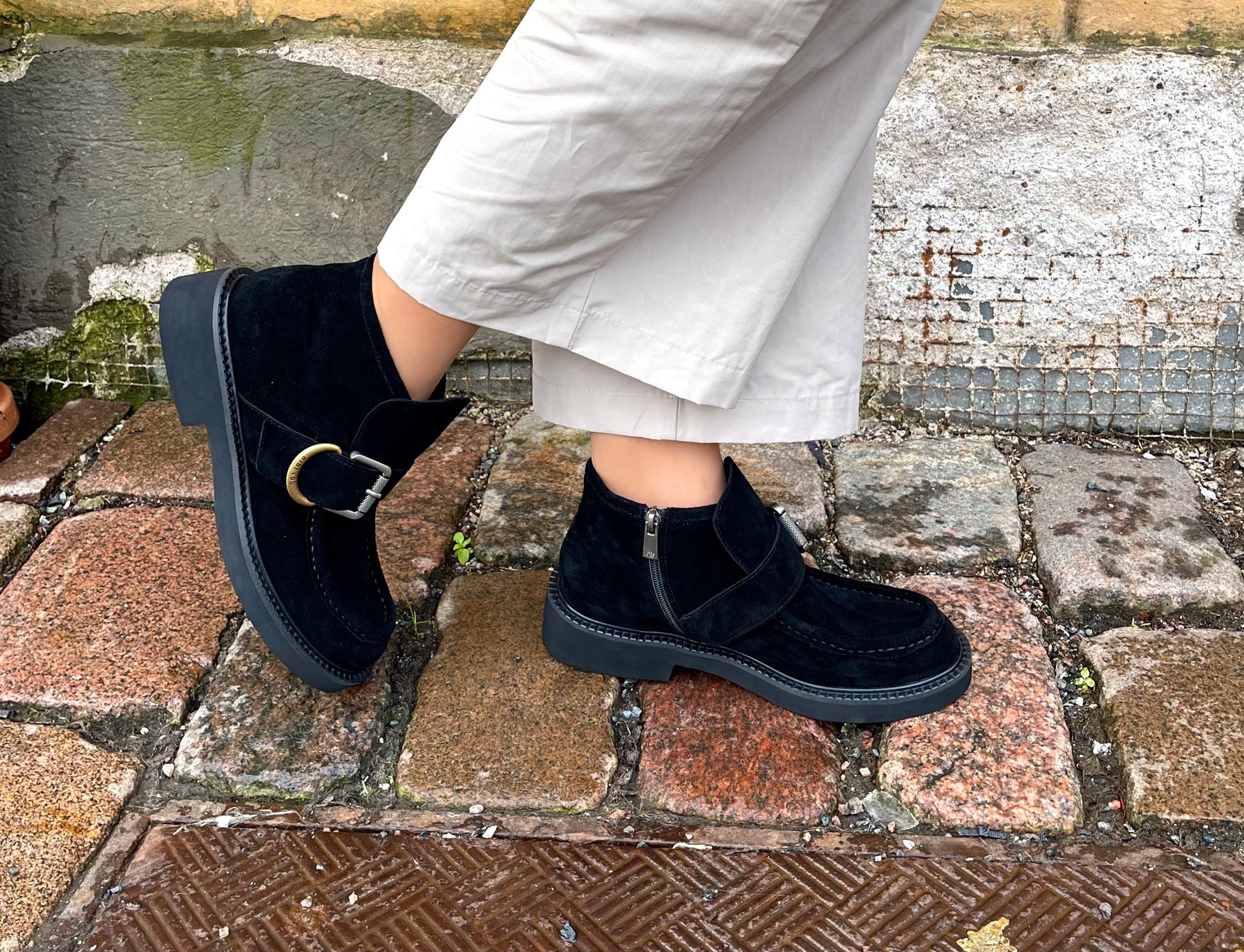 Tyylikkäät mokkanahkanilkkurit, joissa yhdistyvät loaferin ja nilkkurin muoto. Pehmeä musta mokkanahka antaa kengälle hienostuneen ilmeen, ja solkikoriste tuo kokonaisuuteen modernin yksityiskohdan. Monikäyttöiset nilkkurit, jotka sopivat täydellisesti niin farkkujen kuin siistien housujen kanssa.