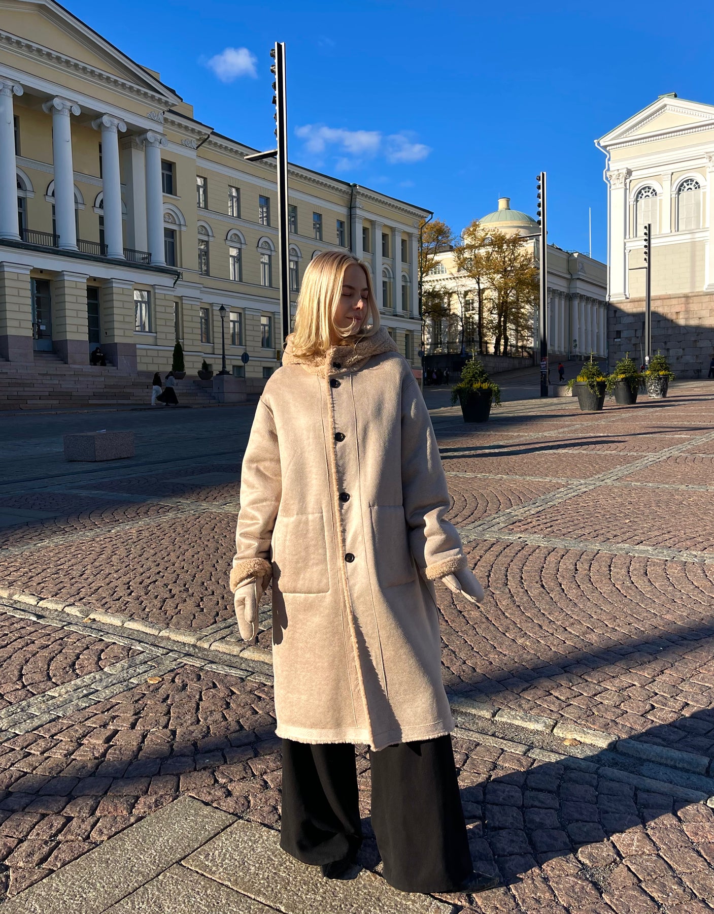 Tämä pitkähkö teddy-takki yhdistää käytännöllisyyden ja modernin muodin. Takki on käännettävä, eli voit vaihtaa ilmettä nopeasti tilanteen mukaan. Takissa on myös mukana käännettävät sekä irroitettavat lapaset. Tässä takissa yhdistyy sekä tyylikkyys että lämpöisyys. Yhdistä farkkujen ja esimerkiksi t-paidan kanssa rennompaan kaupunkilookiin, tai käytä hieman siistimmän asun kanssa illalla.