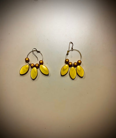 Kaunis, neljästä erikokoisesta, syvän vihreästä helmestä tehty korvakoru, joka valon osuessa hohtaa kauneuttaan.
